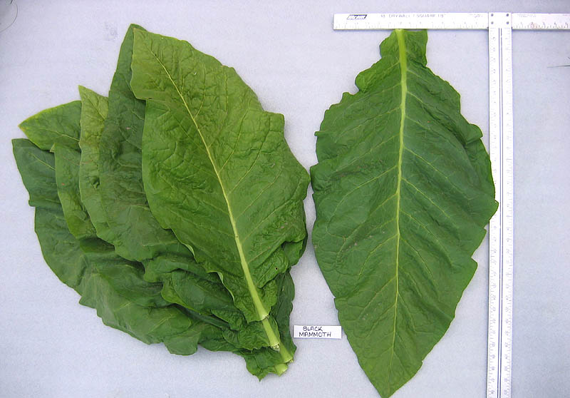 | Black Mammoth is a dark tobacco that produces large, think, heavy weight leaves. The stot plants are very weather resistant. It grow to about 4' 1/2 to the flower head and produces an average of 13 to 14 leaves per plant. The leaves average 16 to 18 in width and 30 to 33 inches in length. Maturity and flower are in about 60 to 65 days, |