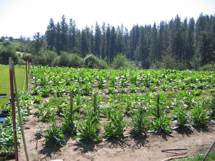 Set the seedlings outside in filtered or dappled sunlight for 3-4 hours per day for a week before planting out. This will help them acclimate, and harden off the seedlings to an outdoor environment, especially if you have been using indoor artificial light. Plant the seedlings in rows spaced 2 feet in all directions after the danger of frost has passed. Water them in after planting and keep the soil moist until plants are established. It is normal for plants to wilt after transplanting and they may appear not to grow much during the first 1-2 weeks. All the growth is taking place under ground at this stage. Once established, tobacco requires little water. Fertilize lightly at planting and again in 4-6 weeks if needed.