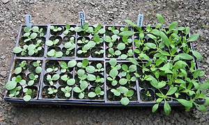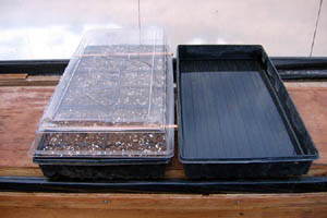Sow seeds indoors in flats, trays or small pots 8 weeks before your last frost date for transplanting outdoors. A plastic tray with 4 or 6 pack inserts works very well. Fill the inserts with a fine starting mix soil or potting soil. Pack the soil very lightly. Potting soil should be screened to 1/4" to remove any large chunks. Thoroughly soak the soil and let drain before seeding. Do not use garden soil.  Use a good quality starting or screened potting mix.