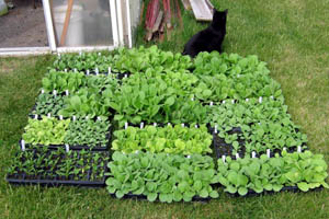When the seeds finish sprouting and start to show their first leaves, stop misting the seedlings, remove the plastic cover and move the trays to a fully lit area such as a greenhouse, cold frame or under grow lights. Florescent shop lights work well. Place the lights no more than 3-4 inches above the seedlings. Keep the lights close so the seedlings don't stretch for it and become leggy. Keep the soil moist, but do not over water. Over watering is the main reason for seedlings failing to grow properly and may cause the seedlings to dampen off. It also impedes the roots downward growth. Water when the surface of the soil first begins to appear dry on top. It is best to water from the bottom up by soaking the tray of seedlings in a second tray without drain holes filled one inch deep with water. Allow the seedling tray to soak for about 1/2 hour or until the water has wicked up and the soils surface appears wet again. Remove the seedling tray from the watering tray and let it drain. Do not let the seedlings stand in water for a prolonged period. This will kill the developing roots.